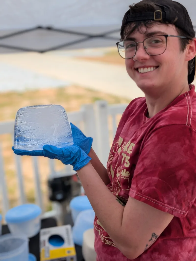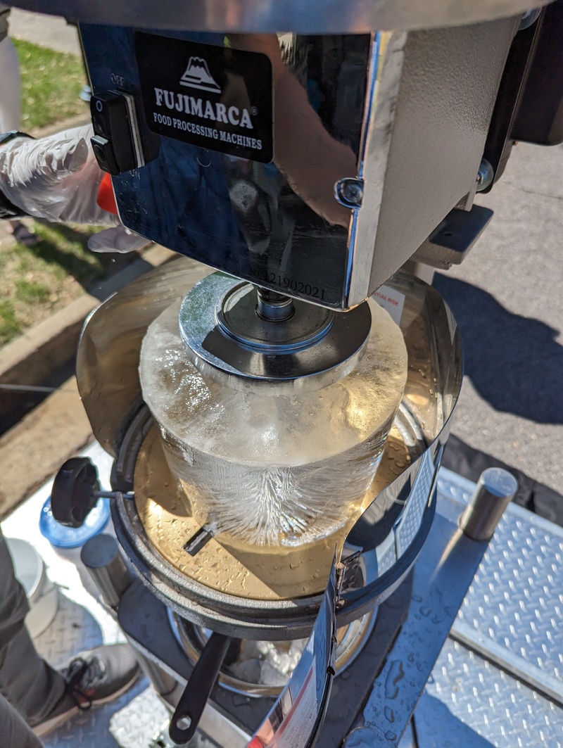 Then, we use our machine which comes straight from Hawaii to shave a large block of ice into soft, thin flakes.